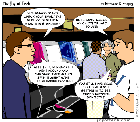 | Welcome to the Joy of Tech... by Nitrozac and Snaggy. It's a little bit simpler in style than our other comic After Y2K, and a little more topical. We hope you enJoy! |