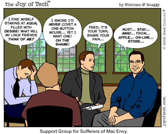 If you're using a Mac and a newer version of Explorer, here's a neat trick courtesy of MacMerc. Drag the above little image to the top tool bar of your browser, it should "stick" afterwards. Now you have a graphical link to the Joy of Tech, one that will update everytime a new comic is uploaded. If you need to delete or move it it, just Command/drag it around, or to the trash.