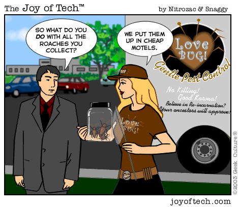 If you're using a Mac and a newer version of Explorer, here's a neat trick courtesy of MacMerc. Drag the above little image to the top tool bar of your browser, it should "stick" afterwards. Now you have a graphical link to the Joy of Tech, one that will update everytime a new comic is uploaded. (You may have to refresh the image manually if it's in your cache.) If you need to delete or move it it, just control button/click and hold, then select delete, or just Command/drag it to the trash.